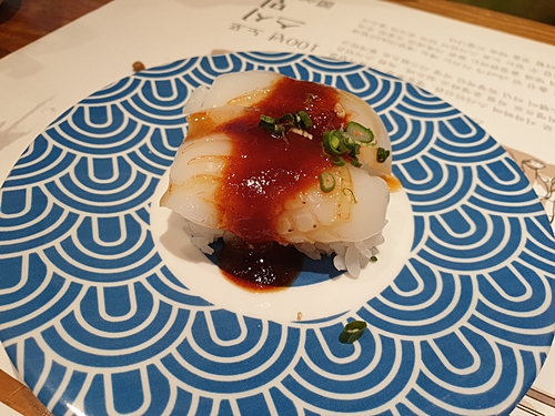 한치위에 불닭소스를 올려서 매콤한 초밥