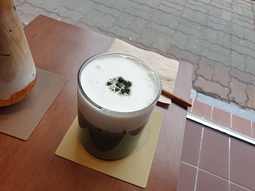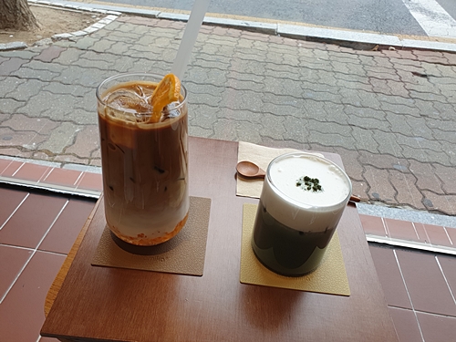 유명하다고 해서 그걸로 주문했었습니다. 쑥쓰럽떼는 아몬드와 쑥파우더가 들어간 쑥라떼로 5800원, 오렌지 비앙코는 오렌지가 들어간 커피로 5300원입니다.