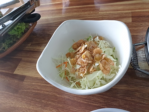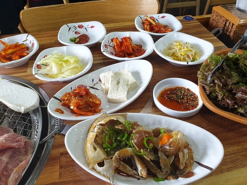상추, 샐러드, 쌈장, 게장 등이 나옵니다.