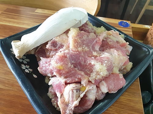 주문한 마늘갈비가 나왔습니다. 새송이 버섯과 함께 달콤짭짤한 양념과 마늘이 발려져있는 돼지갈비가 나옵니다.